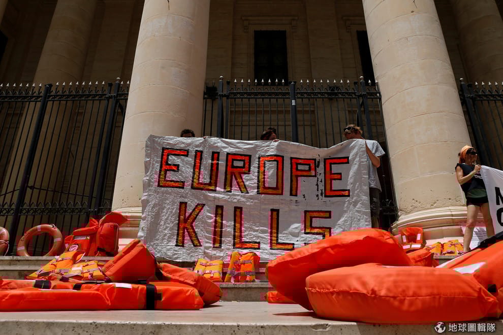 在首都法勒他(Valletta)的法院前,非政府救援組織「生命線」(Lifeline)等成員拿著寫有「歐洲殺人」字樣的布條,站在橘色救生衣和救生艇前,抗議當局拒絕對在地中海載浮載沉的難民伸出援手。