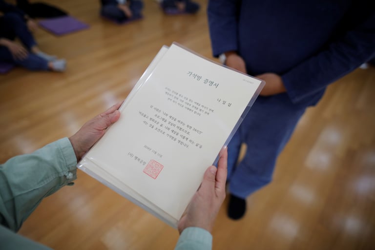 盧珍香接著說,冥想中心的創辦由來和另一位創辦人──她的先生權勇錫(Kwon Yong-Seok,音譯)息息相關。權勇錫過去是一名檢察官,每周工時高達 100小時,身心俱疲只能仰賴酗酒和抽菸紓壓。