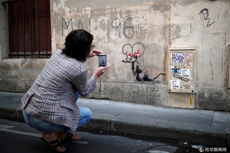乍看之下就是隻戴著米妮(Minnie)風格蝴蝶結的寫實風老鼠,不過仔細看的話,就會發現牆面上寫著「5月 1968年」(Mai 1968)的字樣,這是指法國在 1968年5月、法國全國數十萬人響應的學生運動「五月革命」。