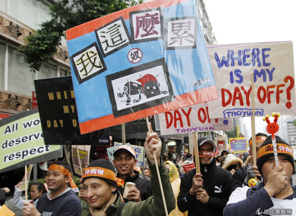 2011年在台北街頭,來自東南亞的移工們一同走上街頭,爭取將看護工作者的權益納入勞基法中,同時也要求獲得休假等基本權益。