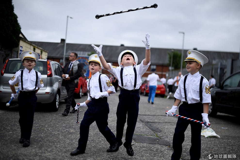 在北愛爾蘭首都貝爾法斯特(Belfast),參加七月慶祝活動的男孩把指揮棒往天上拋,這一幕被在場的攝影師捕捉了下來。