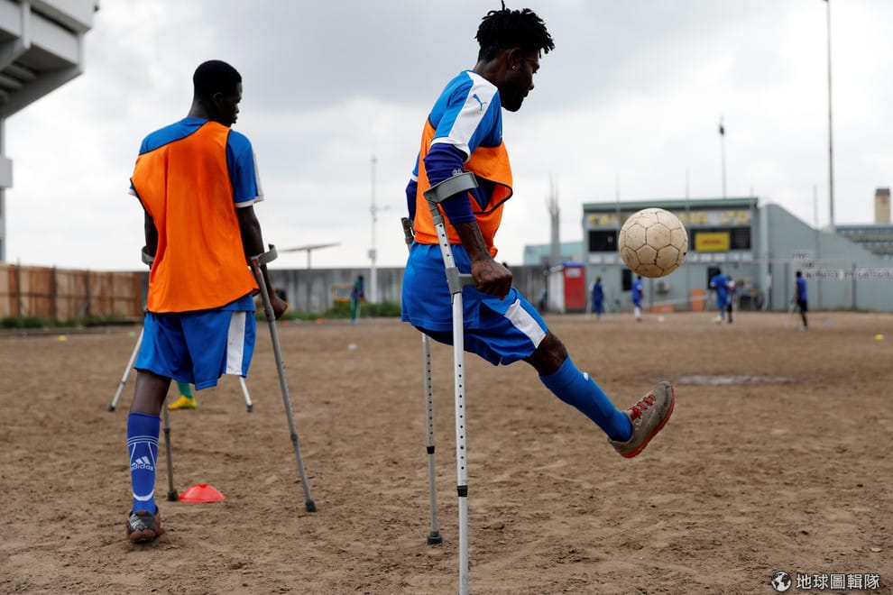 在拉哥斯(Lagos)國家體育場,單腳足球隊的成員正在練習。
