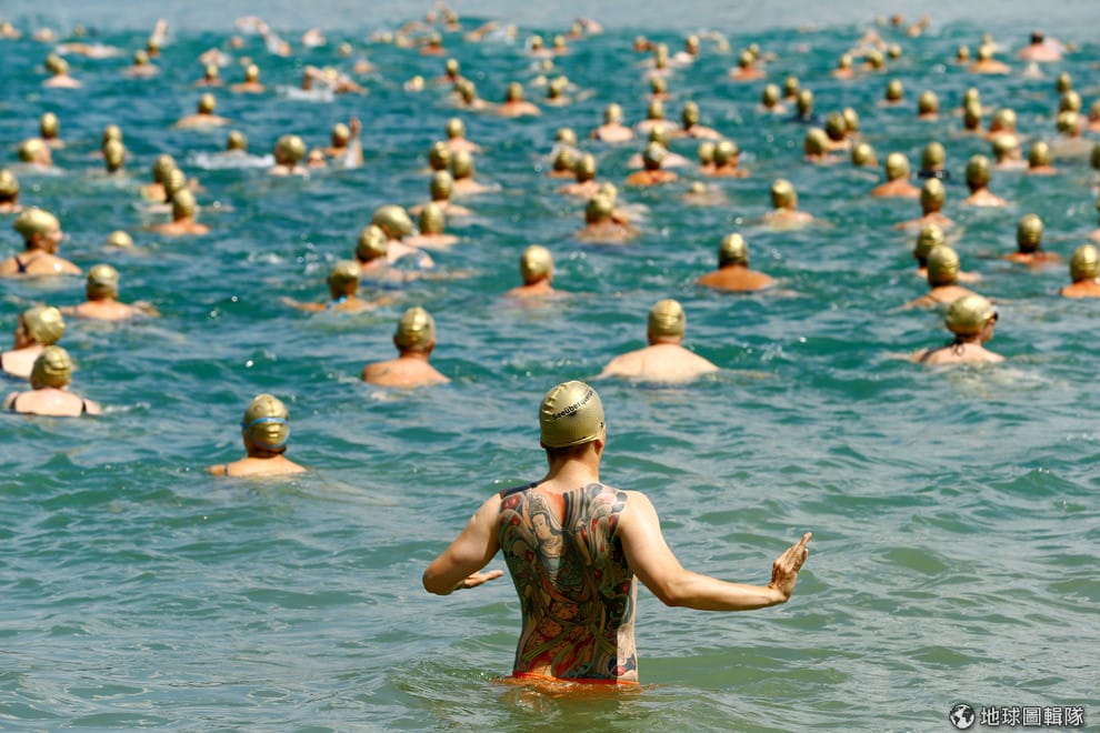 在一年一度的泳渡蘇黎世湖活動上,戴著金色泳帽的民眾紛紛下水,準備挑戰 1,500公尺的泳程。