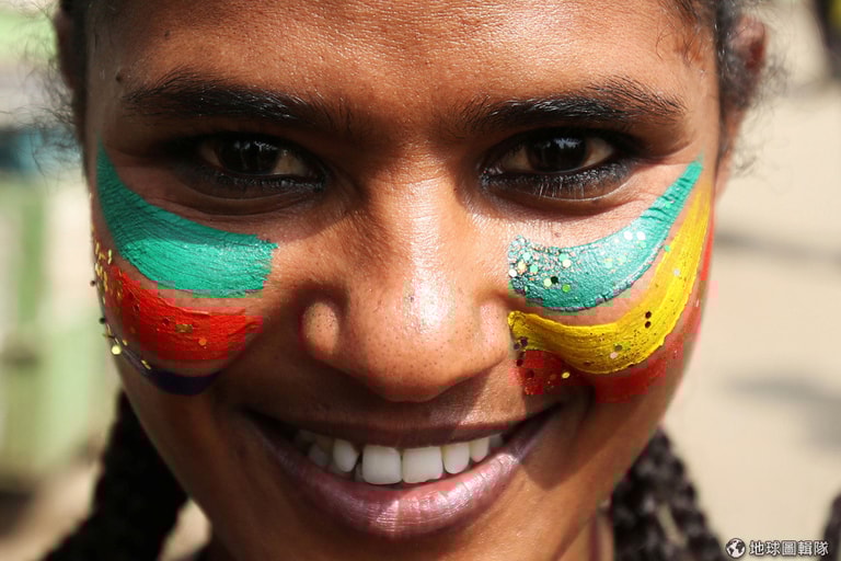 在阿迪斯阿貝巴(Addis Ababa)國際機場,一名女子在臉頰彩繪上衣索比亞國旗的綠、黃、紅三色,準備歡迎來自厄利垂亞的總統阿費沃爾基(Isaias Afwerki)來訪。