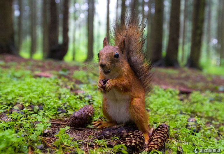 在首都明斯克(Minsk)的一座森林公園裡,一隻松鼠抱著松果大快朵頤。