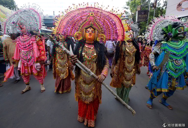 在加爾各答的年度乘車節(Rath Yatra)遊行上,負責表演傳統舞蹈的舞者穿上華麗的衣裳上街。在乘車節這一天,印度教信徒們會把神明的雕像搬上車遊行,讓在大街上的民眾可以共襄盛舉。