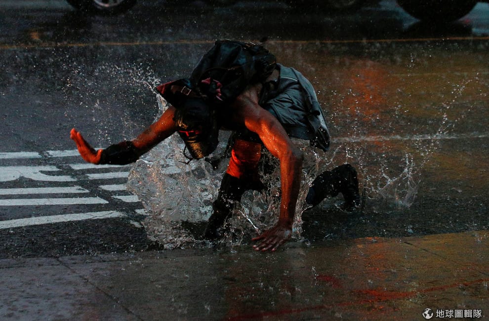 在下大雨的紐約時代廣場上,一名男子不小心跌了一跤,激起路上水花。