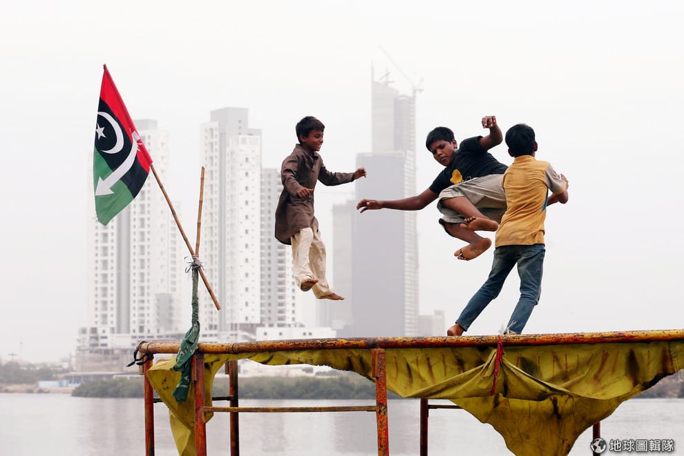 在有 2,080萬人、全球人口數排第七名的喀拉蚩(Karachi),孩子們在貧民窟裡生了鏽的彈跳床上玩得不亦樂乎。