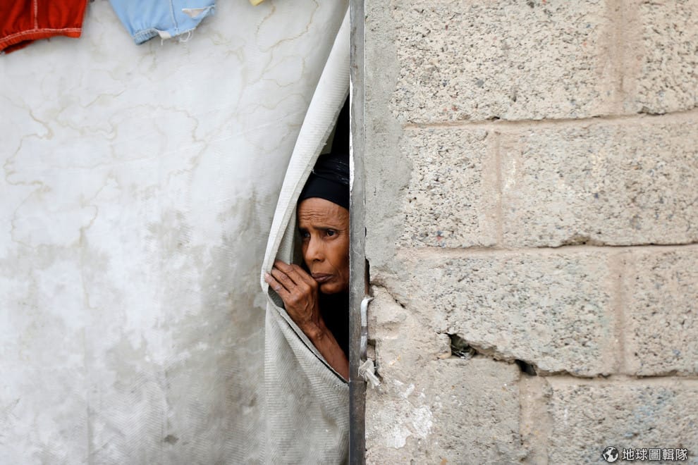 在首都沙那(Sanaa)的難民營中,一名逃離紅海港口城市荷台達(Hodeidah)的女子從簾子後探出頭來,她和家人因為內戰的關係不得不離開家園。