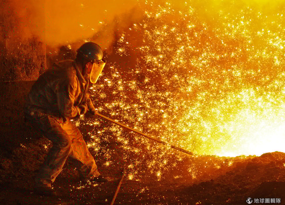 在遼寧省大連市的東北特鋼廠,一名工人正在冒出星火的熔鐵旁工作。