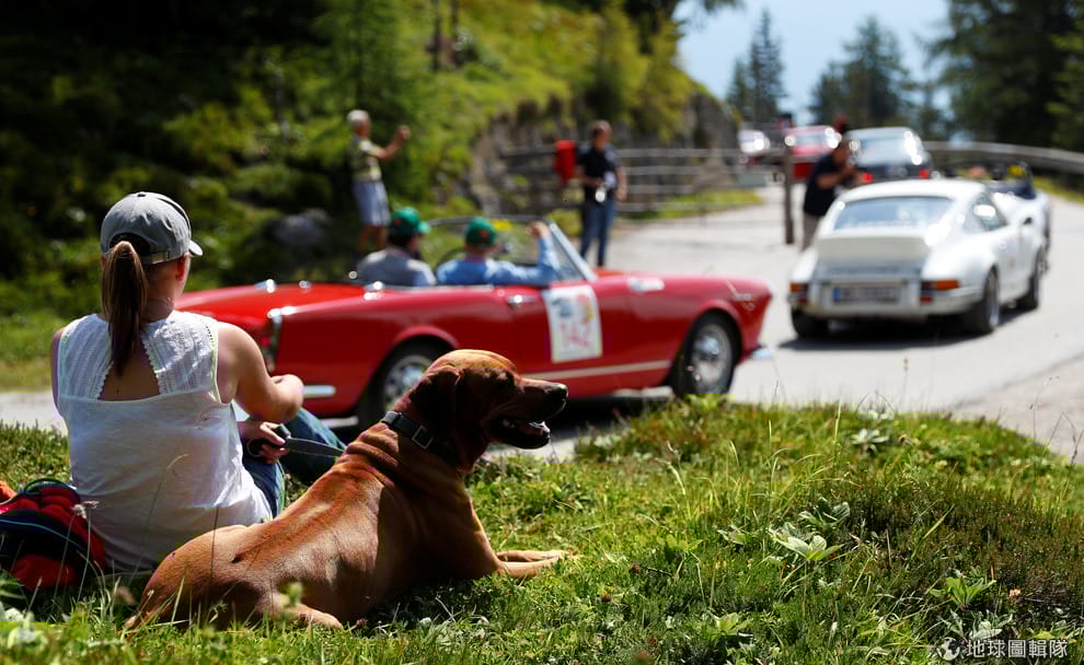 在靠近格勒布明(Groebming)的Stoderzinken山上,一人一狗欣賞著在山路上奔馳的一輛輛經典車,當地正在舉辦恩斯塔爾經典汽車拉力賽(Ennstal Classic car rally)。