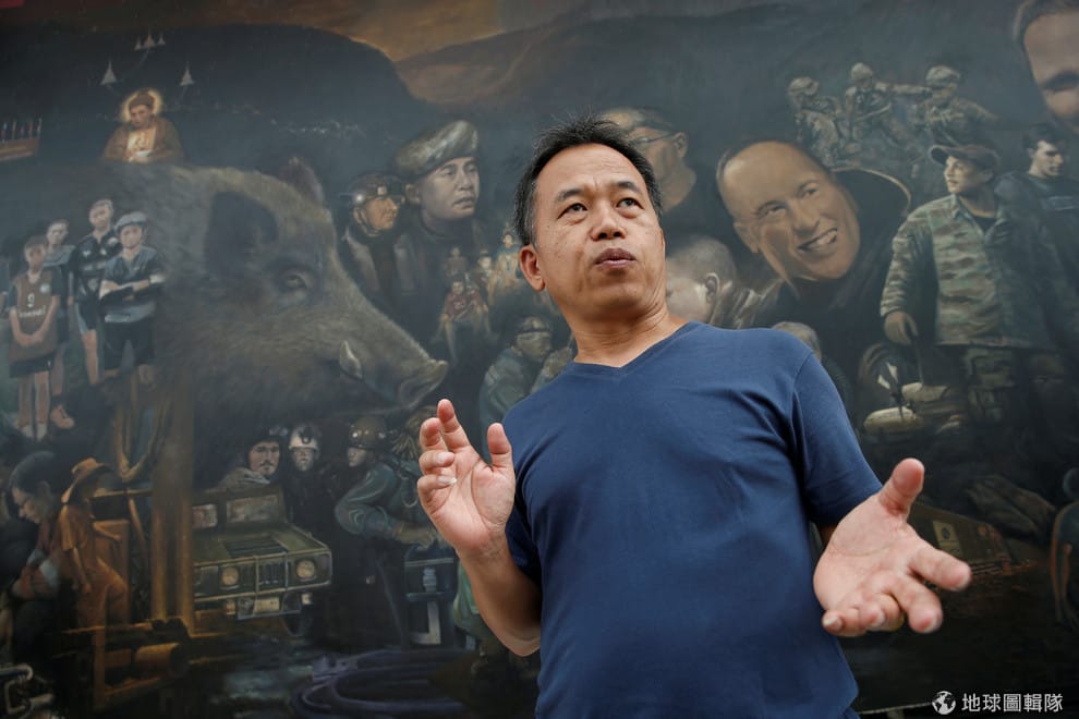 清萊藝廊負責人賈巴(Suwit Jaipom)站在最新完成的壁畫前,這幅壁畫描繪了球隊少年受困洞窟事件,他希望用藝術彰顯這起事件中散發的人性光輝。