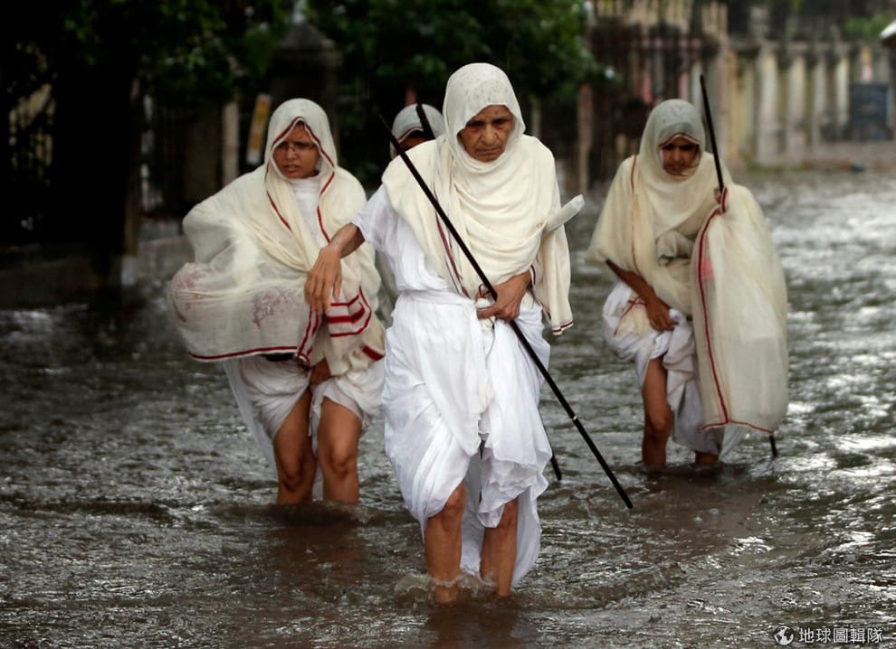 在古吉拉特邦(Gujarat)第一大城艾哈邁達巴德(Ahmedabad),民眾撩起裙擺在大水中行進。