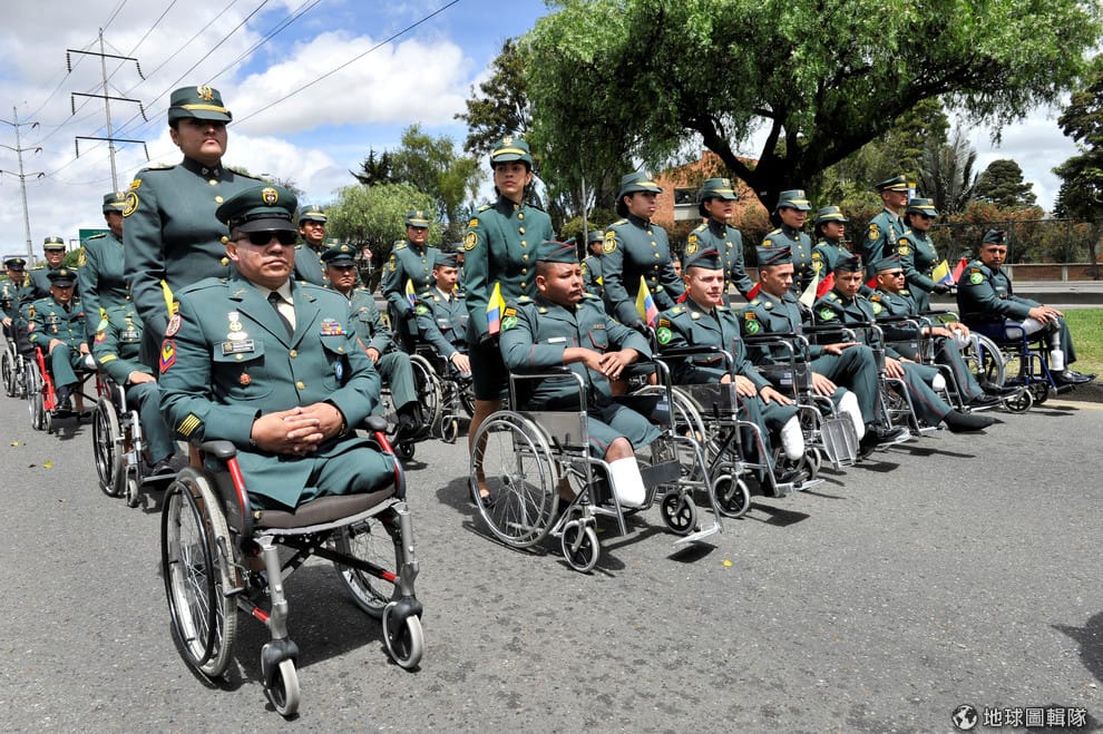 在首都波哥大(Bogota)舉辦的獨立紀念日上,身障軍人穿著正式軍裝登場,慶祝哥倫比亞脫離西班牙統治 208年。