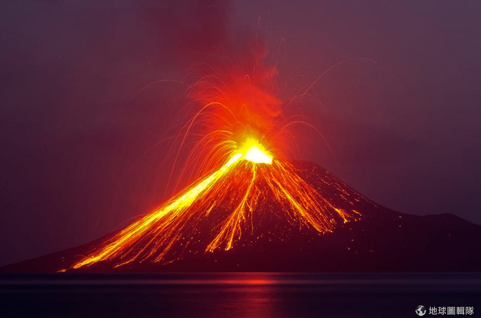 位於楠榜省(Lampung province)拉卡塔島(Rakata island)的喀拉喀托火山(Krakatau)噴發中,火紅的岩漿在夜空中特別明顯。