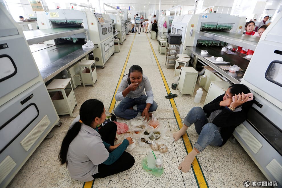 在台商優盛鞋業的製鞋廠中,女工們在午休時間坐在地上一邊聊天,一邊填飽肚子。