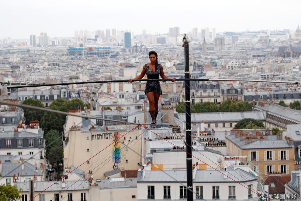 在巴黎蒙馬特山丘,專業鋼索人邦岡嘉(Tatiana-Mosio Bongonga)小心翼翼地拿著平衡桿,走在往聖心堂方向的鋼索上,吸引了底下遊客的目光。