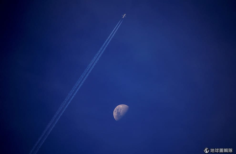 在澳洲新南威爾斯州(New South Wales)城鎮岡尼達(Gunnedah)上空,一架飛機拖著長長的蒸氣尾跡(也稱飛機雲)與一旁的月亮相映成趣。
