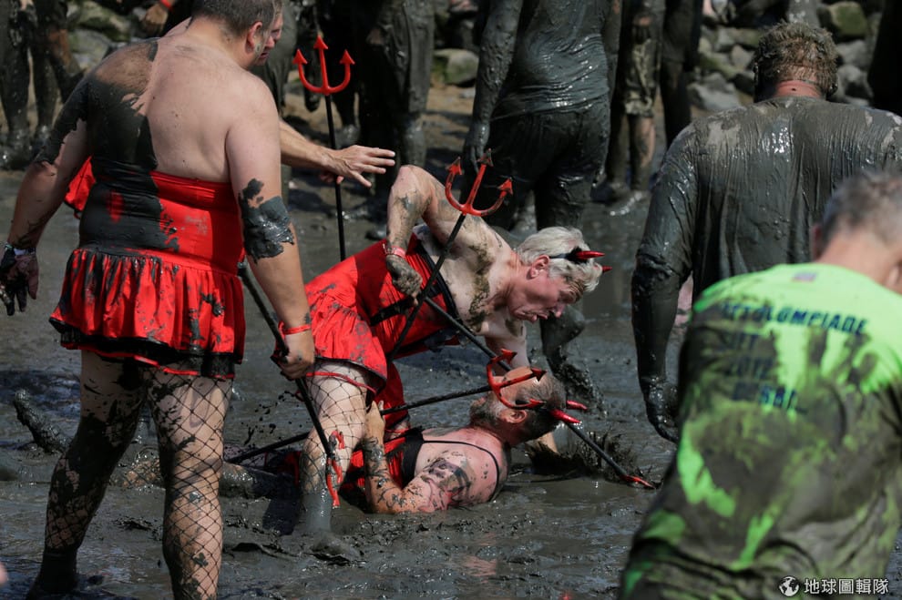 在布倫斯比特爾(Brunsbuettel)的「泥巴奧林匹克」(Wattoluempiade, Mud Olympics),打扮成小惡魔的參賽者在場邊互相打鬧,他們等會就要來場精彩的泥巴地手球賽。