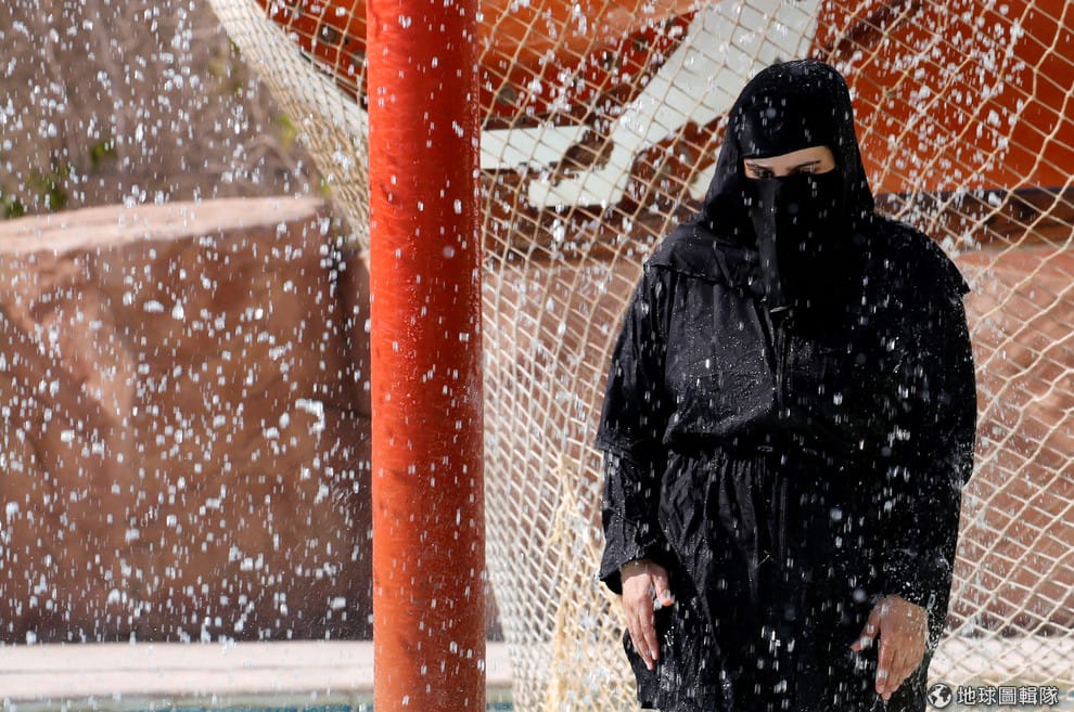 在蘇伊士(Suez)蘇赫奈泉(El Ain El Sokhna)的游泳池,一名穿著尼卡布(niqab)的女子透過灑水器一解濕熱天氣帶來的不適感。