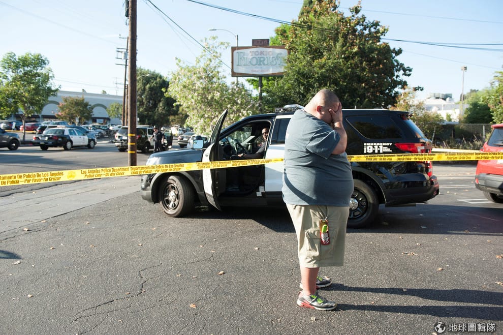 在洛杉磯一家喬氏連鎖超市(Trader Joe’s)外頭,在聽聞人質危機解除後,一名喬氏超市的員工仍在停車場邊等待進一步的消息。