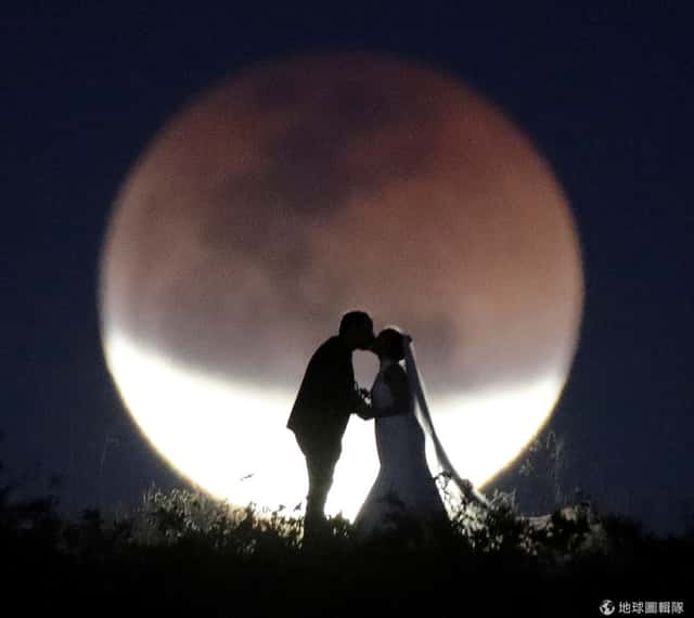 一對佳偶決定月全食當下,拍下獨具特色的婚紗照。本月 28號凌晨,出現了本世紀時間最長的月全食,也因為此時的月亮離地球比較遠,使得月亮會呈現紅色一般的「血月」。