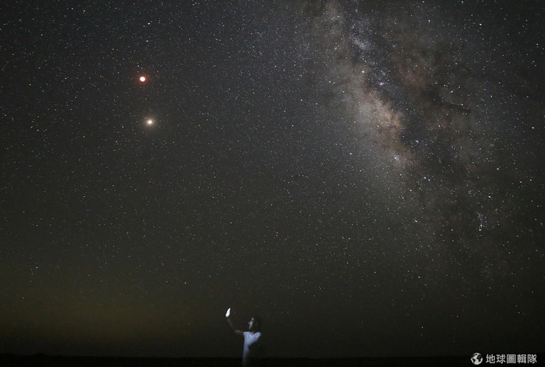 在法尤姆省(Al Fayoum Governorate)的沙漠上,一名男子在銀河耀眼的星空下,準備把眼前的「血月」給拍攝下來。本月 27號凌晨,出現了本世紀時間最長的月全食,也因為此時的月亮離地球比較遠,使得月亮會呈現紅色一般的「血月」。