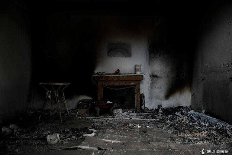 在緊鄰港口的馬蒂村(Mati),一棟房屋內部因為受到大火摧殘而呈現一片焦黑。