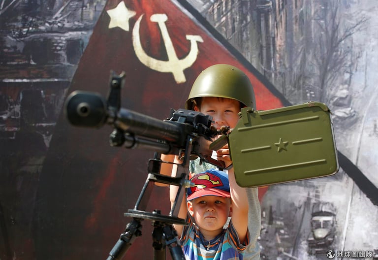 莫斯科(Moscow)郊外正在舉行 2018年國際軍事比賽,只見兩名孩子正在把玩前蘇聯時期的武器模型。