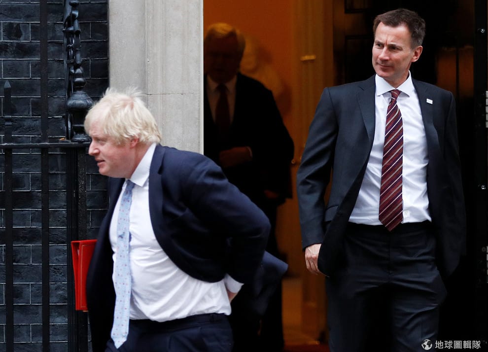 三周前請辭的前外交大臣強生(左)也曾多次失言,受到媒體大篇幅的報導。圖為他和杭特走出英國首相官邸唐寧街十號。