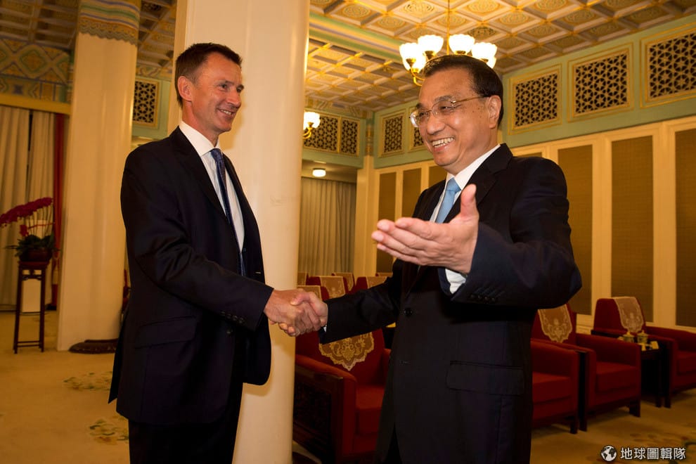 面對遠道而來的英國外交大臣杭特,中國國務院總理李克強開心和他握手。