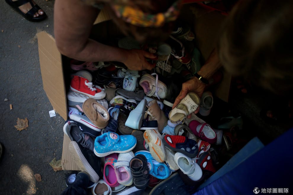 志工正忙著幫非洲移民的孩童挑選合適的鞋子。這些移民所搭乘的充氣艇在直布羅陀海峽被西班牙國民警衛隊截獲,他們隨後便被送到西班牙南部市鎮洛斯巴里奥斯(Los Barrios)的體育館。