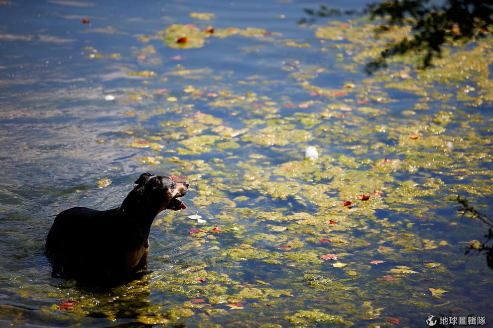 在漢普斯特德荒野(Hampstead Heath),一隻狗狗正開心地在公共水池裡玩耍。