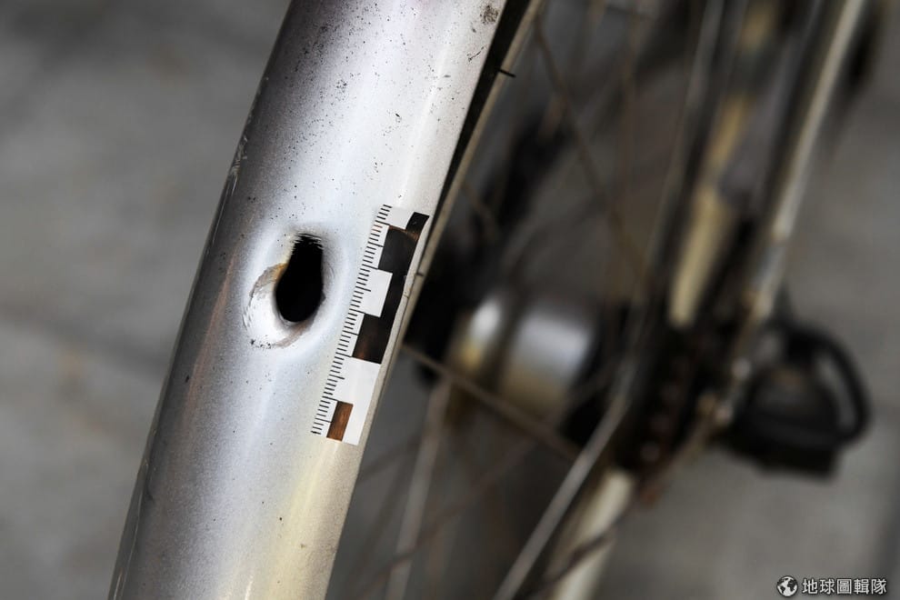 在瑞典首都斯德哥爾摩(Stockholm),警方開槍後所留下的彈孔在腳踏車上留下了痕跡。