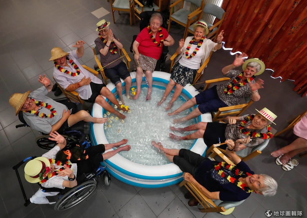在養老院內,居民們一同把腳泡在充氣游泳池裡,希望可以趕走躁熱難耐的天氣。