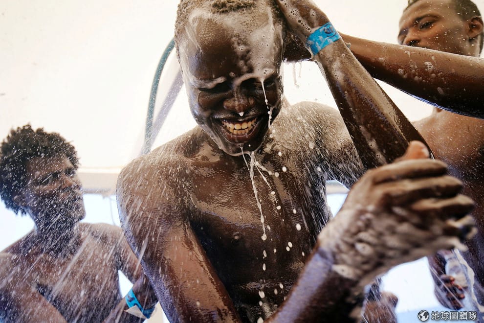 在西班牙難民救援組織 「張開雙臂」(Proactiva Open Arms)的救援船上,來自非洲的移民在獲救後正在接受梳洗。