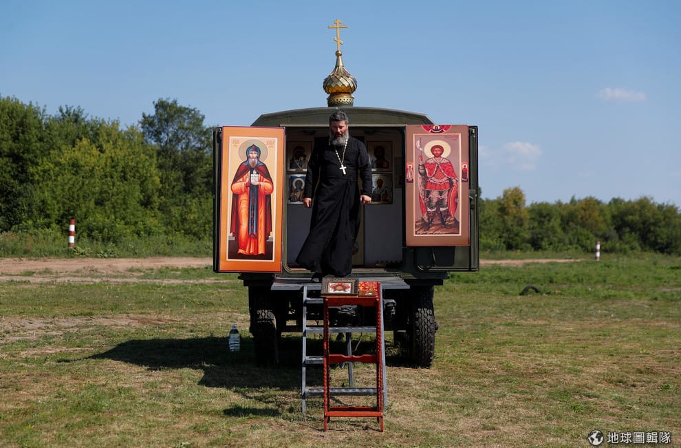 一名傳統東正教的神職人員正準備離開移動式的教堂,這裡稍後即將開放水域軍事競賽,作為 2018國際軍事比賽活動的一部分。