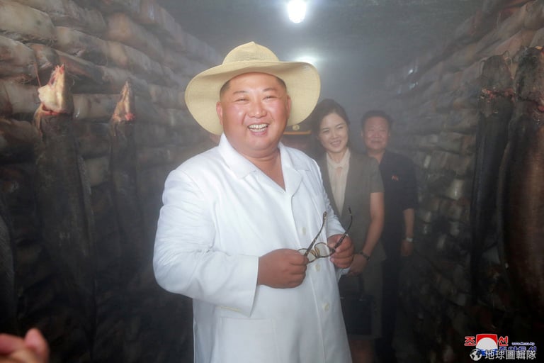 在這張由朝鮮中央通訊社(KCNA)釋出的照片中,北韓領導人金正恩和妻子李雪主開心參觀鯰魚工廠。