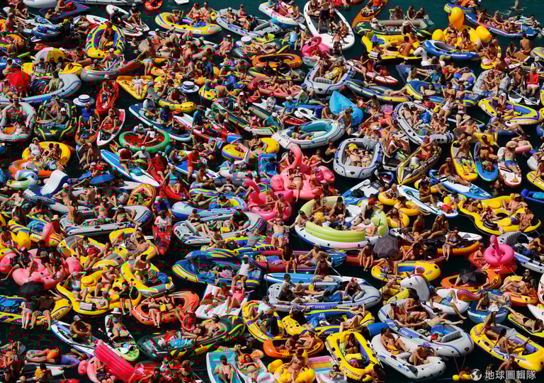 在琉森湖(Lake Lucerne)上,人們三五成群地躺在橡皮艇上作日光浴。