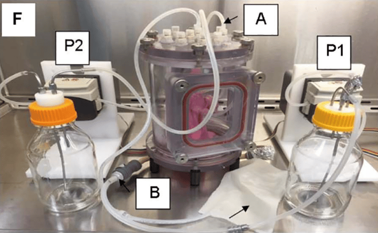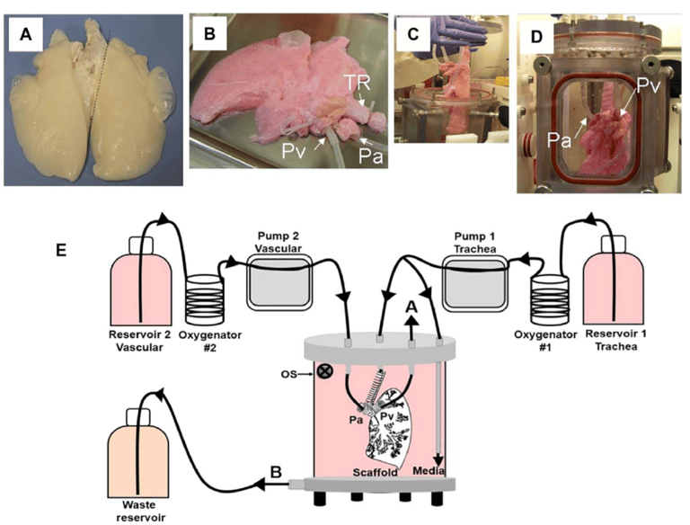 接著,研究人員取出等待器官移植的豬的幹細胞,並移植到這個豬肺支架裡面,整組「豬肺支架含豬肺細胞」在研究團隊特製的生物反應器(bioreactor)裡面接受生長因子的刺激 30天後,就能讓這個人工肺發展出血管和肺泡組織。