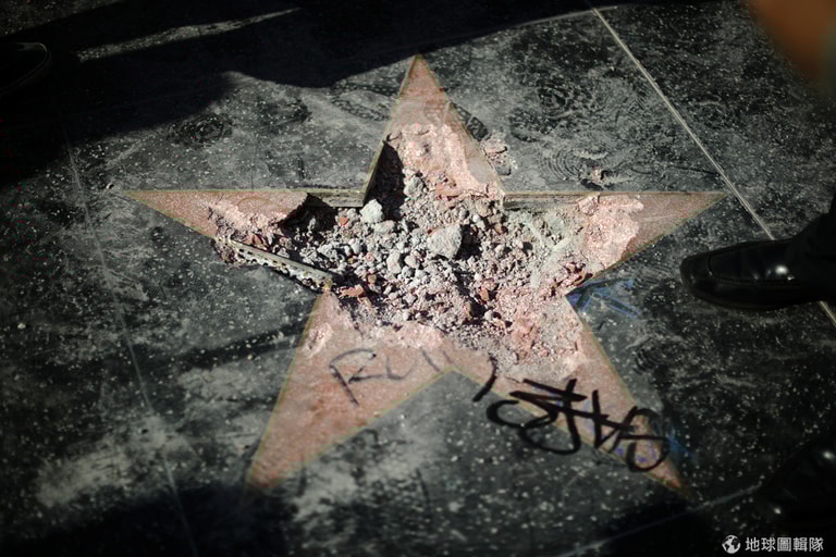 現在,川普位於星光大道上的星星在上個月被鋤頭挖爛還沒修好,而過去這顆星星也多災多難。2016年10月,一名男子拿槌子破壞川普星星。不只如此,這顆星星也曾被噴漆噴上和納粹符號相像的「卍」字號。它也曾被迷你圍牆包圍過,民眾藉此來抗議川普在美墨邊界築起「又大又美麗」的圍牆。