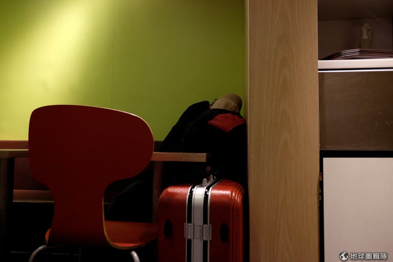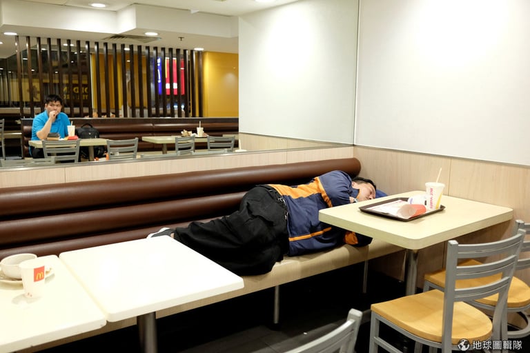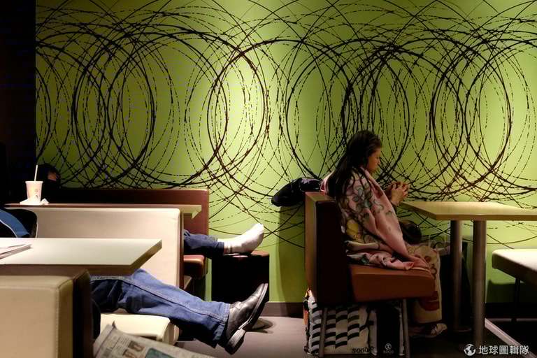 在香港一家 24小時營業的麥當勞,今年 63歲的史蒂芬陳(Stephen Chan)在結束貨運工的工作後來到此處。戴著耳機的他在蓋好棕色夾克後,就蜷曲在角落的假皮沙發上打盹起來。