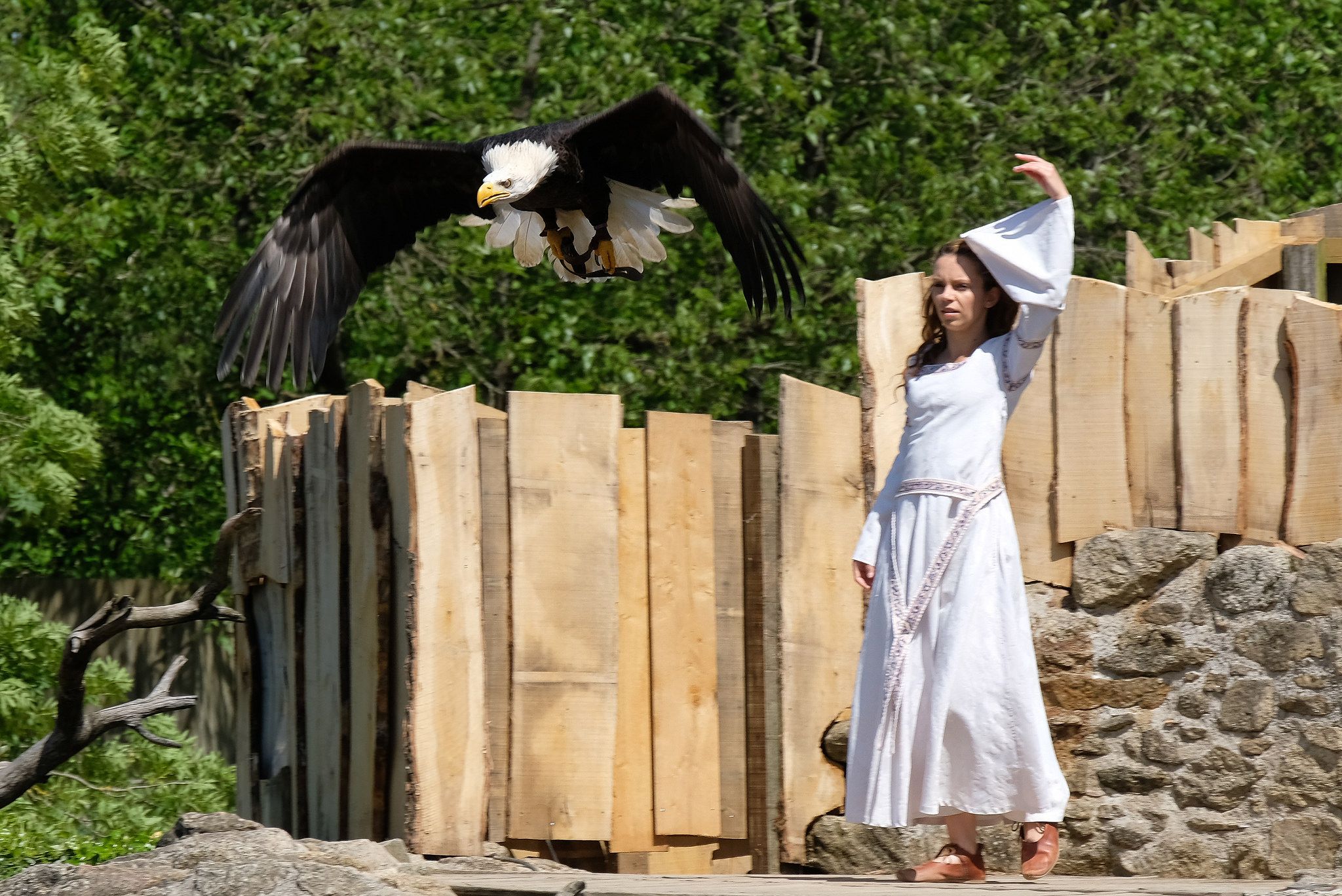 圖為狂人國主題樂園的飛鷹表演一景。在狂人國飛鷹表演的其中一個橋段為:烏鴉摘了一朵玫瑰送給城堡裡的公主。