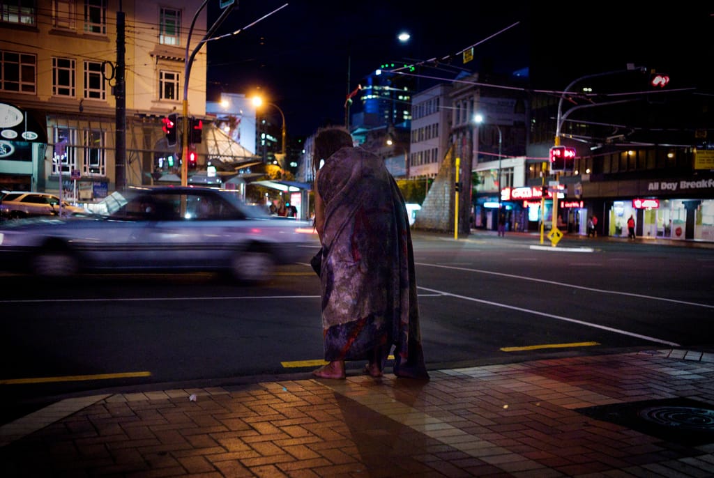 在紐西蘭首都威靈頓的大街上,一名流浪漢披著毛毯禦寒。認為禁令缺乏野心的紐西蘭經濟學家指出,將外國投資人拒之門外,也不代表一般民眾或窮人能有房可住。