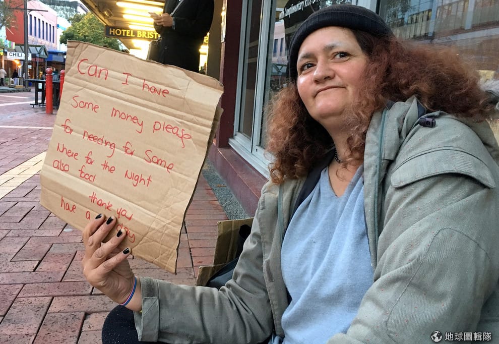 在紐西蘭首都威靈頓(Wellington)的大街上,一名無家可歸的女子手拿紙板向路人乞討。