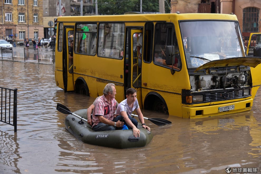 在城市利維夫(Lviv),人們透過橡皮艇離開了淹水的街區。