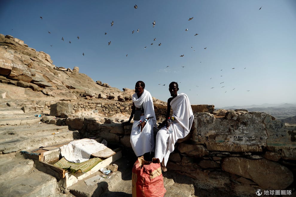 兩名穆斯林朝聖者坐在阿努爾山(Mount Al-Noor)上休息,根據傳說,先知穆罕默德(Prophet Mohammad)就是在這座山的希拉山洞(Hera cave)裡,透過天使加百列(Gabriel,在阿拉伯語中被稱為吉卜利勒)得到了宣講伊斯蘭教的第一條訊息。
