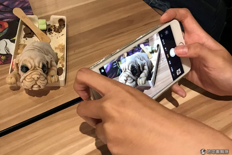 來到高雄市鳳山區的義大利餐廳「J.C.co 藝術餐廚」,你可以看到顧客們繞著眼前的小狗冰淇淋嘖嘖稱奇,一邊七嘴八舌地說「欸很像真的耶」、「你吃這個狗腿啦」、「它有屁股!」,一邊討論到底應該從何吃起,畢竟,這隻小狗冰淇淋實在太擬真了。