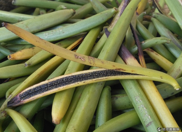 由於香草小農為了要躲避香草小偷而提前採收綠色的香草豆莢給中盤商,有的中盤商會將這些香草豆莢真空包裝起來,就能延長存放時間,等待價格更好的時間點再轉賣出去。