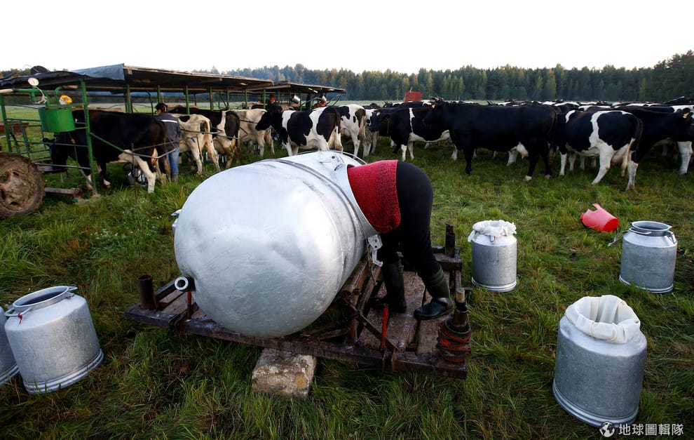 一名員工忙著清理大大的牛奶桶,準備來幫乳牛們擠奶。